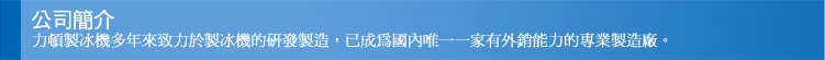 本公司於1995年成立至今,歷經短短的十一年時間,就已經成為臺灣本土製冰機行業之個中翹楚,獲得了眾多客戶的認可,目前已在臺灣佔有45%的市場,並且呈逐年上升趨勢。其客戶遍及臺灣全省及日本、新加坡、馬來西亞、香港、中國大陸等東南亞國家及美洲、歐洲的部分國家。
